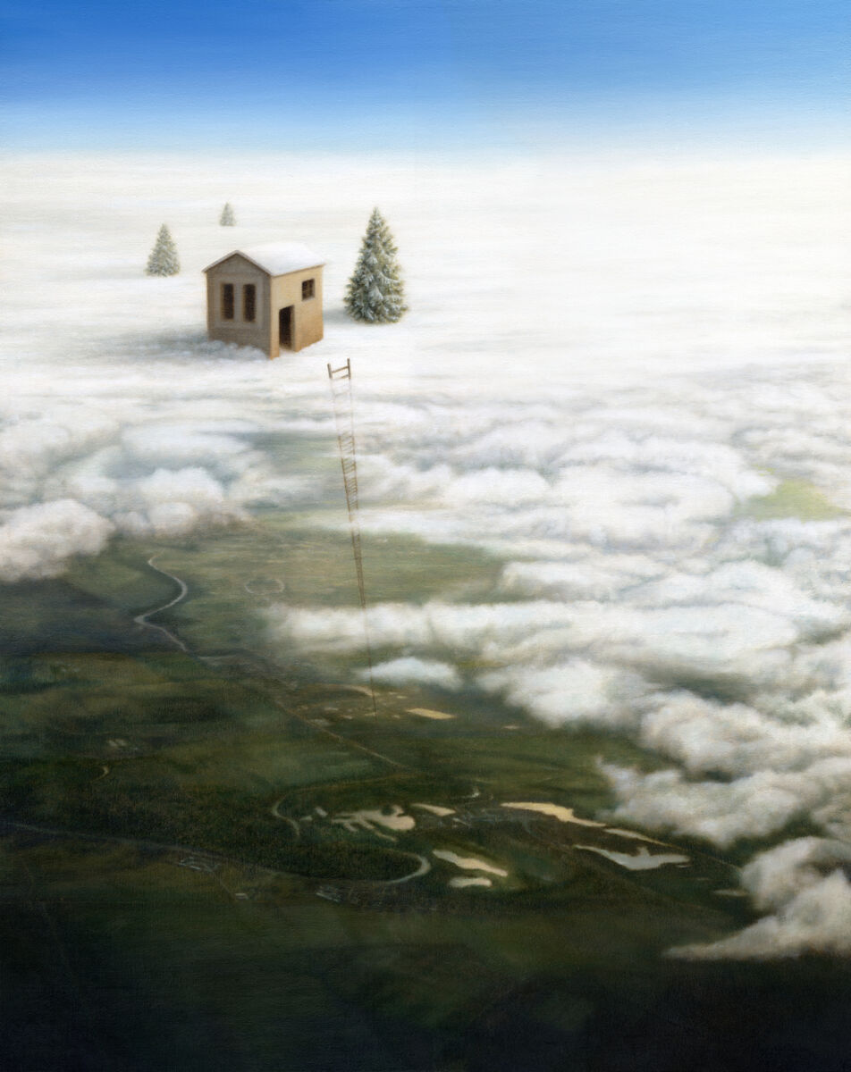 house on clouds, pine trees, aerial view, open door, snow, cloudscape art, cloud landscape, spiritual connection, meditative, inner peace, tranquility, duality, two worlds, ethereal, sanctuary, solace, contemporary surrealism, surreal, surrealist, nature, weird, peaceful, meaningful, message, meaning, dream, dreamlike, intriguing, inspiring, thought provoking, art that makes you think, whimsical, fantasy, perception, meditative, ethereal, spiritual, self-reflection, positive, happy, happiness, clouds