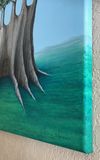 This is one of the very few paintings based on a dream. Even though my dreams can be really crazy, I seldom use them for my paintings. This is an exception. The dream was actually a very short one. It was just the painting right in front of my eyes for a few seconds and nothing else. When I woke up I knew I had to paint it so I made a sketch and then I painted it. It almost feels as if I had not created it. It just popped in my head during my sleep. My brain spit it out for me. So there is no story to it. I could come up with some crazy description but I prefer to leave it as it is. It is up to you, the viewer, to find your own interpretation if you feel connected to it. That would make this surreal painting complete and I would feel very happy.